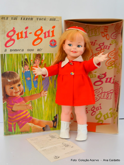 Ganhei minha Gui gui quando tinha 7 anos como incentivo para fazer exercícios muito doloridos, após minha perna ter atrofiado por passar 40 dias internada por febre reumatica.Tinha a propaganda na televisão e meus pais ja tinham perdido uma filha. Então mesmo sem condições meu pai encomendou essa boneca pela dona do mercado. Ela foi buscar em São Paulo e eu me recuperei. Guardava com carinho dentro da caixa original. Estava perfeita. Quando minha filha estava com seis meses meu marido deu a gui gui pra ela brincar. Então ela derrubou quebrou. Não teve culpa, mas fiquei triste.Nunca tive a oportunidade de ver outra igual.Foi bom ver as fotos
