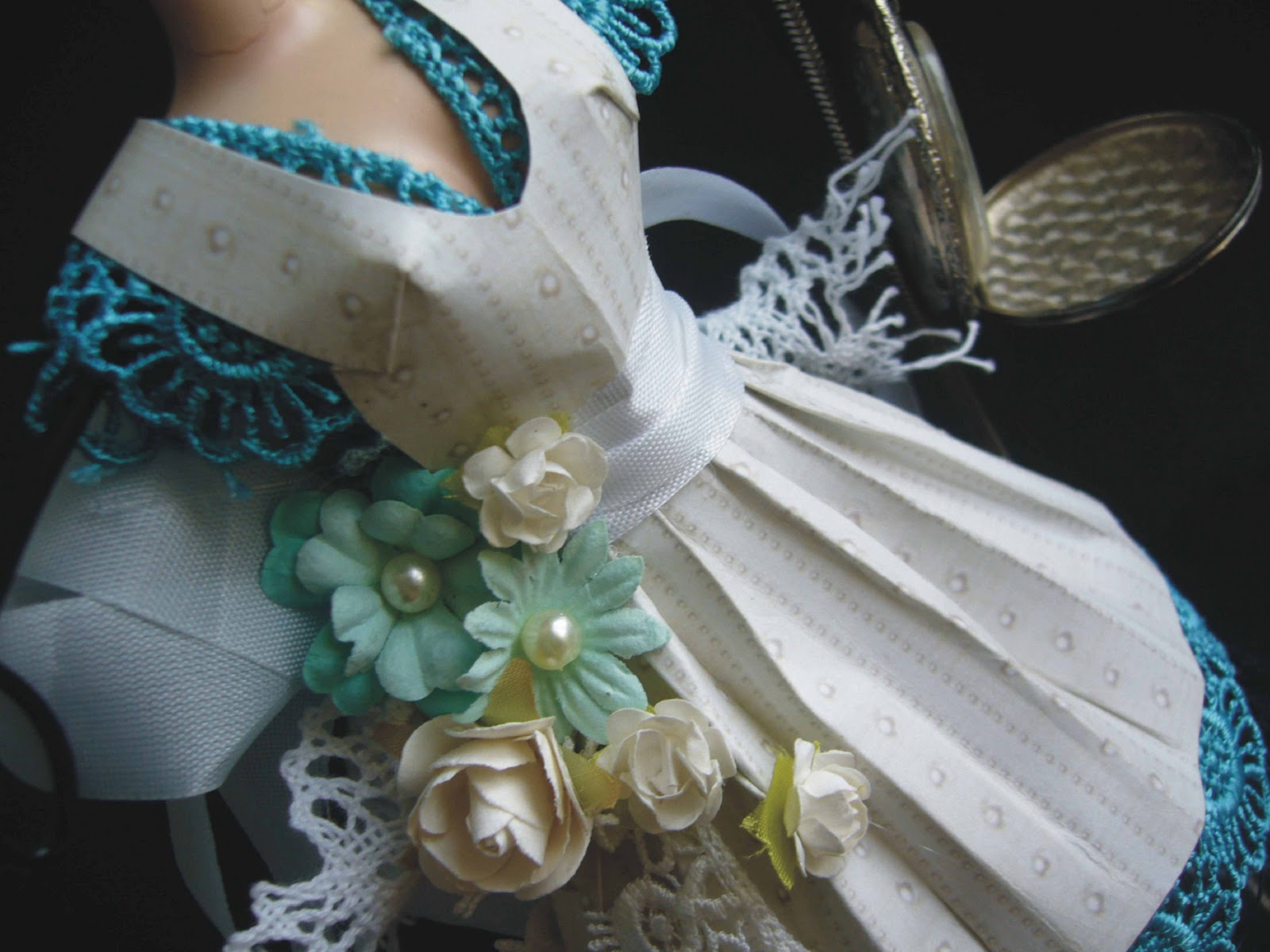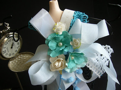 laços, renda , pom pom, guipir e flores decoram a costa do vestido