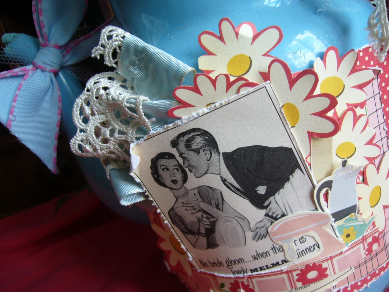 Com toque suave feminino ou minimalista é enfatizada para diferenciá-lo de decoração vintage regular, daí o "chique" como os detalhes que acrescentei na tampa com uma mini luva de pegador de panela, rendas e fitas antigas: