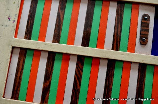3 peças de estojo escolar com tampa deslizante, um com tampa em tirinhas coloridas de madeira e outros dois em tirinhas de formica colorida: