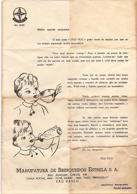 Me lembro que ganhei e fui brincar com minha prima, que tinha todas as bonecas da Estrela, como Lala-lulu, Typpi, Manequinho, Mãezinha, etc, mas ela não gostava e pegava meu glu-glu kkkk.