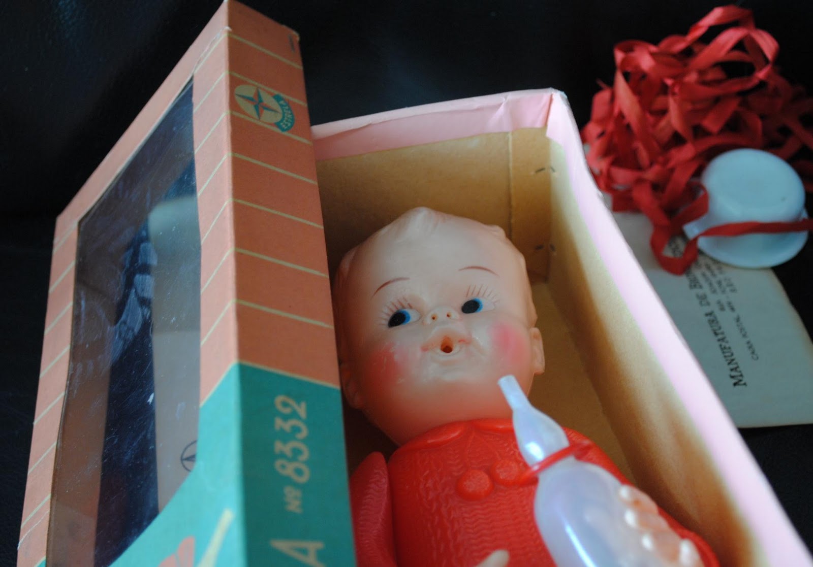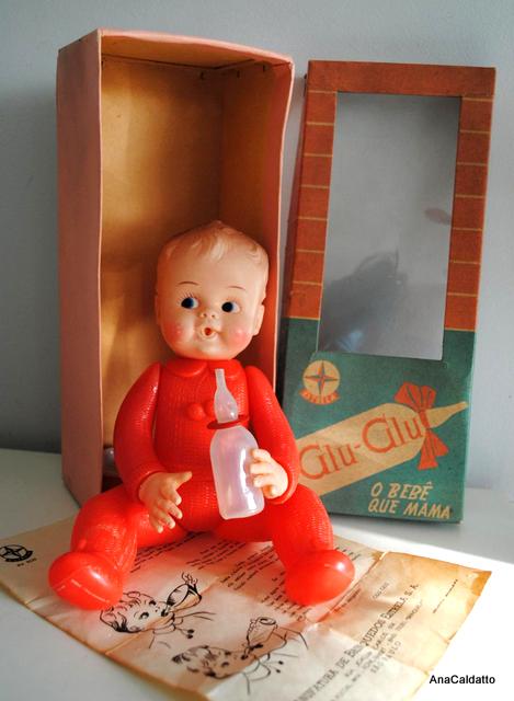 Boneco Glu Glu o bebê que mama com sua mamadeira mágica na caixa original década de 60: