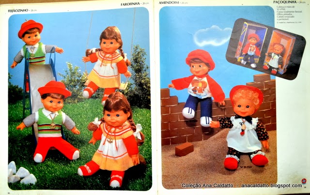 Imagem catálogd da Estrela de 198/81 com coleção boneco Feijãozinho, boneca farofinha, boneco amendoim e boneca Paçoquinha: