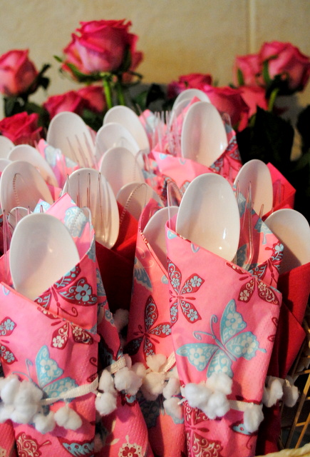 colheres todas enroladinhas em guardanapos com estampas de borboletas: