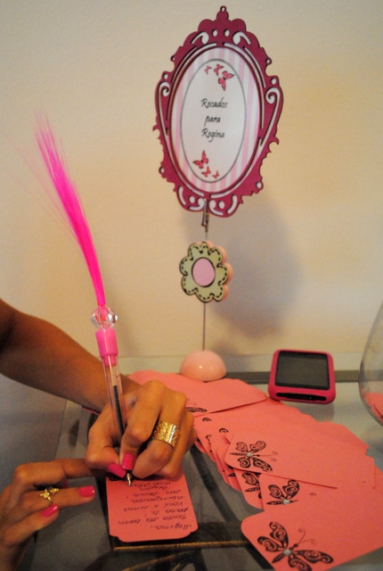 Regina definiu cada detalhe, cada item, usou e abusou da máquina de corte Silhouette para criar todo elemento, exemplo a mesa de recados com caneta rosa e tags: