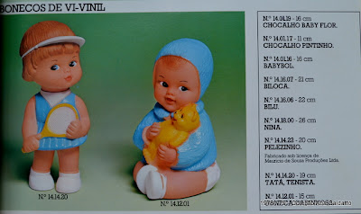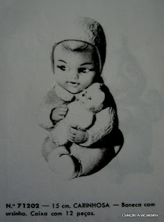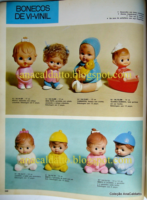 Anaaaaa!!! Será que voce pode me ajudar? meu irmão teve um Bebeto da Estrela, que também segurava uma bola, mas era com outra roupa (só na pintura, é claro): fraldinha branca com peixinhos em baixo relevo, botinha azul, casaquinho azul e um boné ENORME, alto mesmo (era quase 1/3 do boneco)! Procuro o JUCA desesperadamente (esse era o nome que meu irmãozinho deu a ele aos 3 aninhos (agora tem só 46 rsrsrsr). Beijos Ana! sou uma admiradora de seu blog. Excelente pesquisadora! Voce arrasa! Beijos!