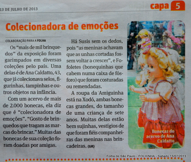 reportagem feita por Gabriela Romeu para Jornal Folha de São Paulo, foi cuidadosa em publicar minhas palavras que gosto de colecionar bonecas que tragam as marcas do brincar da criança