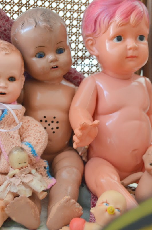 | foto: boneco de porcela, Boneco de massa, Boneco Celuloide e um mini bebê de gesso e um mini bebê de borracha |