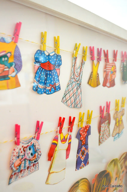 minha poposta é expor as bonecas de papel antigas que ganhei de uma forma que todos meus amigos ao me visitarem possam visualizar em uma grande Moldura Branca com as roupinhas penduradas em um varal presas com minis prendedores: