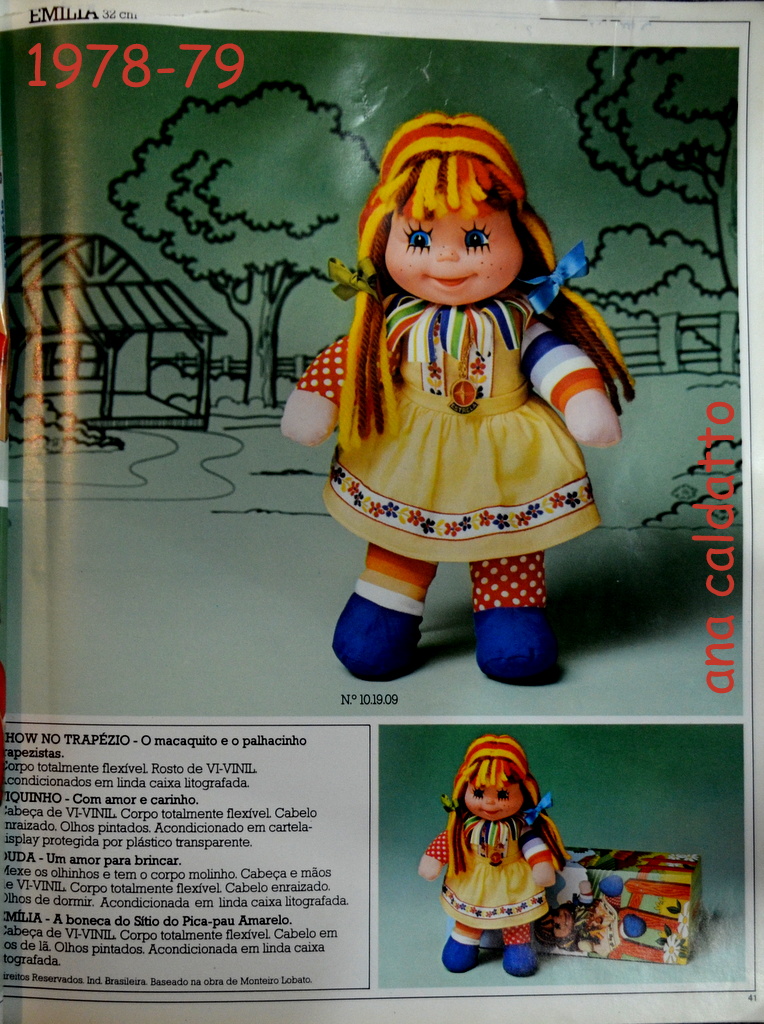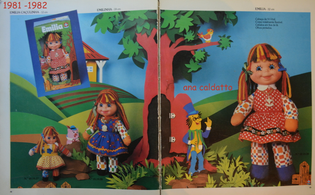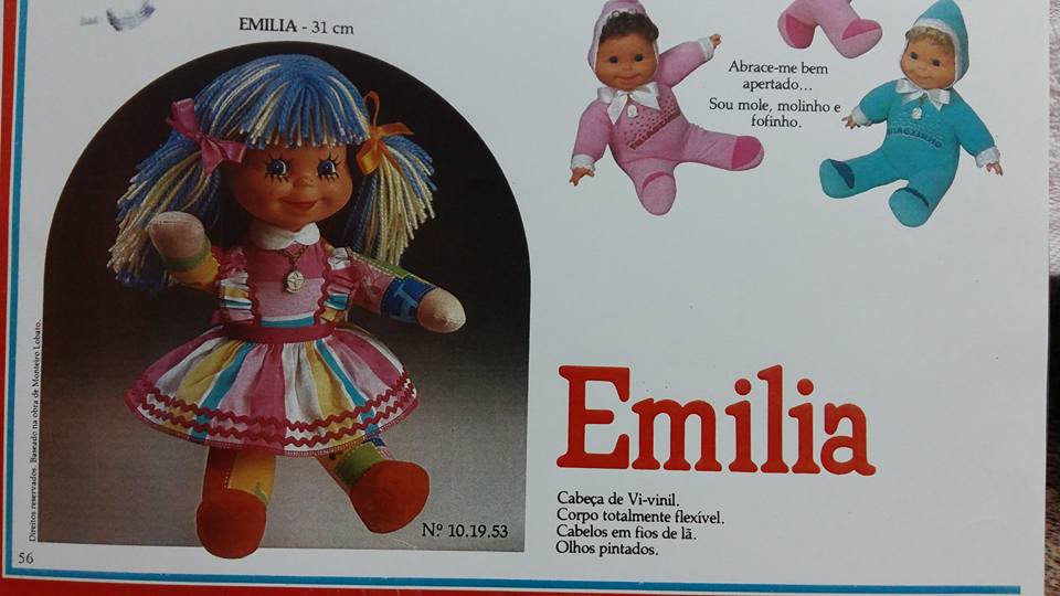 Boneca de pano Emília anos 80 distribuídos e criados pela equipe da Estrela que visitaram pessoalmente o Estúdio de Monteiro Lobato para nascimento da boneca Emília em várias versões como Boneca de pano Emilia caçulinha, Emilinha, Emilia e Emilia cirandinha à Corda: