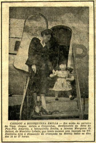 "CHEGOU A BONEQUINHA EMÍLIA Em avião de carreira da Vasp, chegou ontem em congonhas, diretamente do Sítio do Pica-pau Amarelo, a bonequinha Emília, a famosa Marquesa de Rabicó, de Monteiro Lobato, que tanto sucesso vem fazendo na TV. Emilinha está a disposição da criançada na Mesbla todos os dias das 16 às 17 horas":