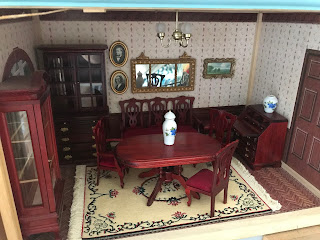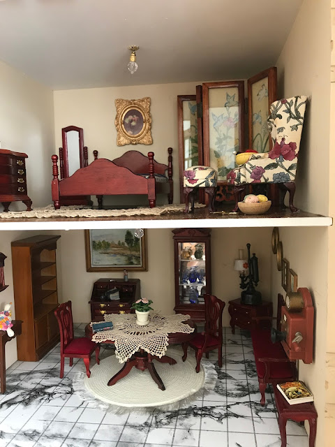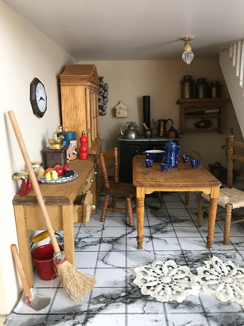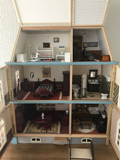 venha espiar uma casa de bonecas recheadas de mini móveis realistas da época: