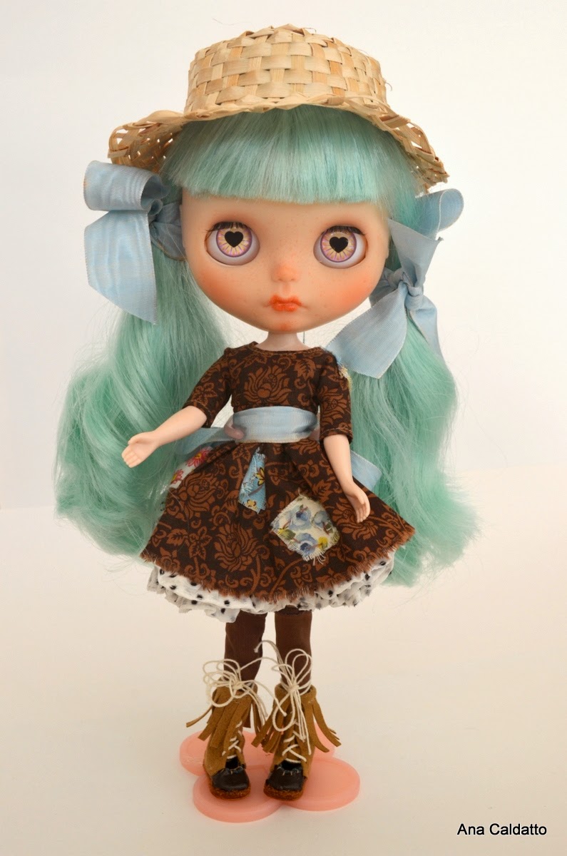 Blythe Isa Marcou presença na festinha Junina com roupa tipica vestido rodado, chapéu de palha: