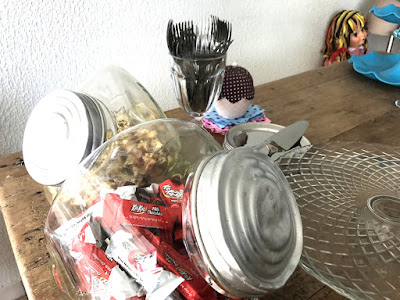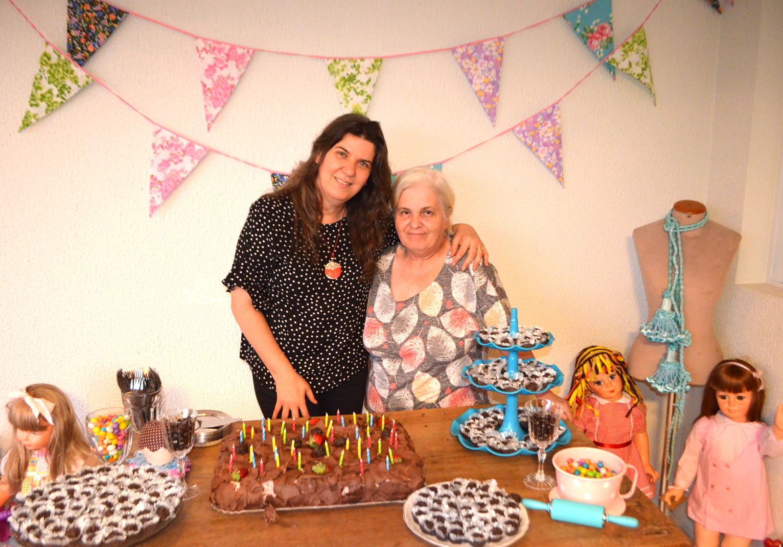 Antigas bonecas Amiguinhas fizeram parte da decoração do tema de festa de boneca da bonequeira de 47 anos aqui: