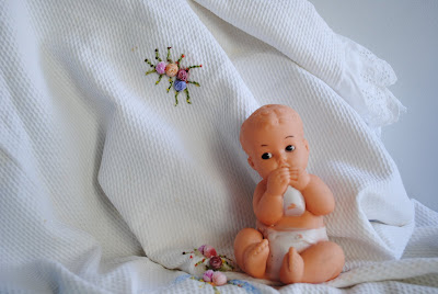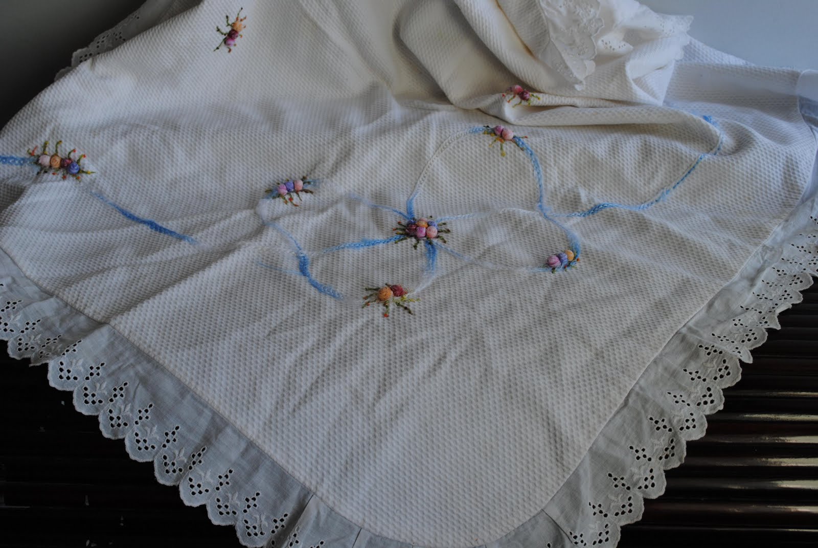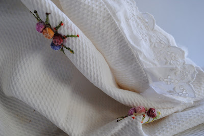 Antiga manta Bebê em piquê com desenho de laço com minis rosinhas de fita