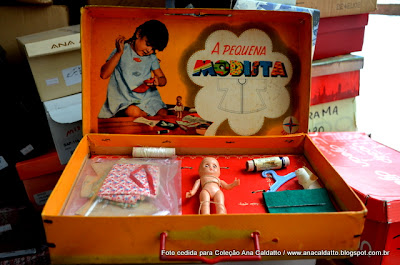criando a moldura ou a mini vitrine foi a forma que encontrei de preservar a original tampa da embalagem da Pequena Modista de 1950 da Estrela, criando um nicho no estilo Shadow Box com todos apetrechos que a criança usava o brinquedo na época: