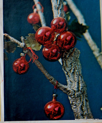 decoração arvore de natal com galho seco e bolas de vidro comum anos 60: