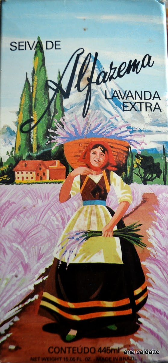 Nostalgia recordar da camponesa carregando na cabeça uma cesta na bela paisagem de campo de Alfazema, embalagem década de 70 Lavanda Seiva de Alfazema da Phebo de 1977: